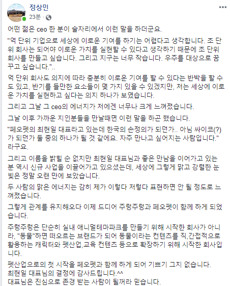 펫 산업의 변화를 넘어 통째로 바꾸는게 내 진심이다. 나는 내가 말한거 다 지킨다. 시간이 더 걸렸을 뿐.. 큰 도전에 함께해주신 정상민 대표님 진심으로 감사드립니다!