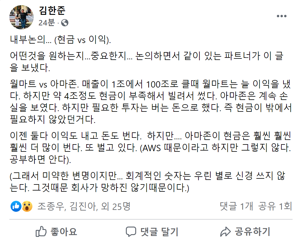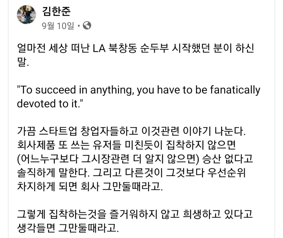 "삼성이 반도체 사업 시작할때 적자 오랫동안 엄청 냈다. 현대가 자동차 사업 시작할때도. 반도체나 자동차나 어느누구보다 잘할 이유는 없었다. 그런데 스타트업이 펀딩받아 적자 내면서 엄청 크고 있는 시장에서 승자 되려고 하면 부정적인 의견만 내는지 모르겠다." -- 이 이야기는 쿠팡, 토스, 또 베스핀 투자자로서 너무 공감했다.