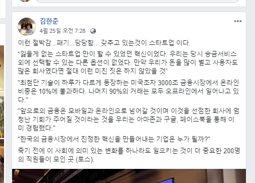 지금도 기적같고 대단하지만 빠른시일안에 여기서 10배이상 커져도 전혀 놀랍지 않을 회사다. 그만큼 대단한 사람들이 많이 모여있는 회사다. #토스