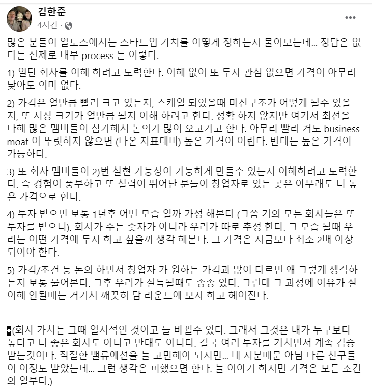 우리들은 요구한다. 높은 밸류 받는게 중요하면 최소한 왜 내회사 가치가 그정도 되는지는 좋은 논리가 있어야된다고. 내가 아는 회사가 별론데 거기 얼마 받았으니 나는 더 높아야된다고는 좋은 논리가 아니다.
