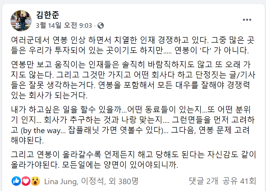 그것 안한다고 회사가 나쁜것은 아니지만... 그것 솔직하게 깊은 생각을 나타내는 회사는 대부분 다 진짜 잘한다. 스푼라디오 Neil Hyukjae Choi 대표님 월 마치고 이런저런 생각/고민들을 읽으면 진짜로 치열하게 잘하고 있구나 하고 저절로 느끼게 된다.