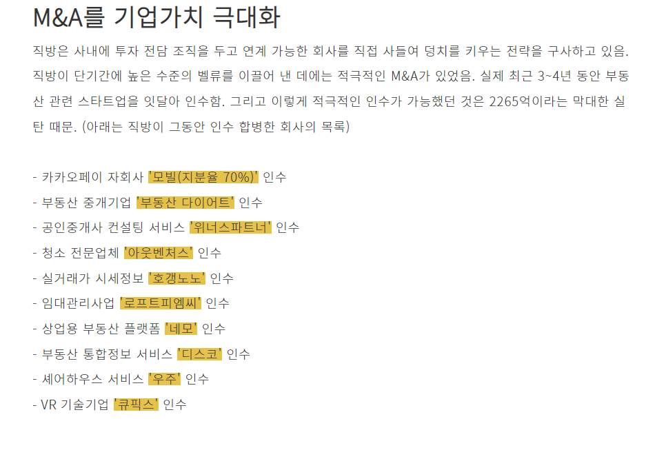 직방 벨류에 대해 M&A에 대한 평가가 있음