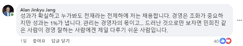 장진규 의장님께서 남기신 이 댓글도 진짜 너무 공감한다. (아웃스탠딩 대표가 남긴 민희진을 채용하시겠습니까)