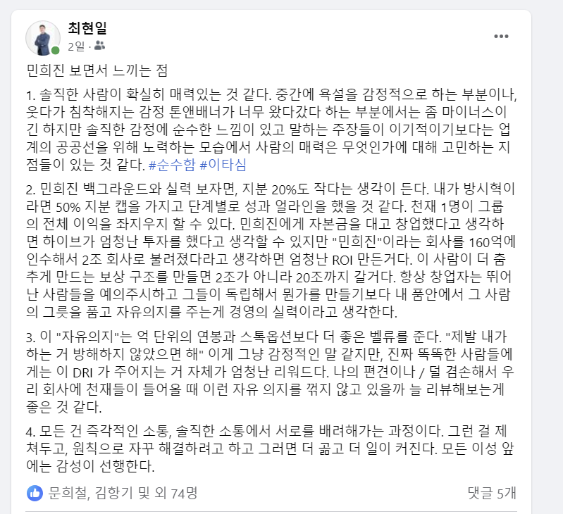 내가 확실히 어나더레벨의 경영자라고 성장할 수 있다고 생각하는게 대부분의 사람들은 민희진을 채용 안한다고 생각함. 뭐 통제가 안된다. 나중에 이상한 일이 벌어진다. 지 멋대로 한다 등등..