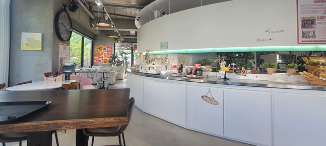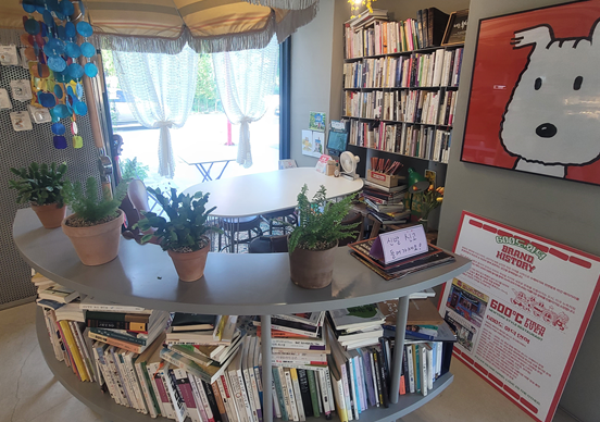 안으로 들어가면 정말 장소들이 아기자기 잘 꾸며져 있다. 편하게 앉을 수 있는 쇼파, 책과 같이 읽을 수 있는 서점 같은 컨셉, 외국처럼 먹을 수 있는 식탁..